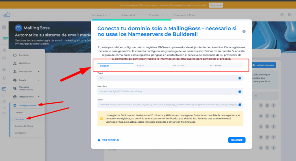 La autenticación se hace mediante registros DNS, normalmente incluyendo: