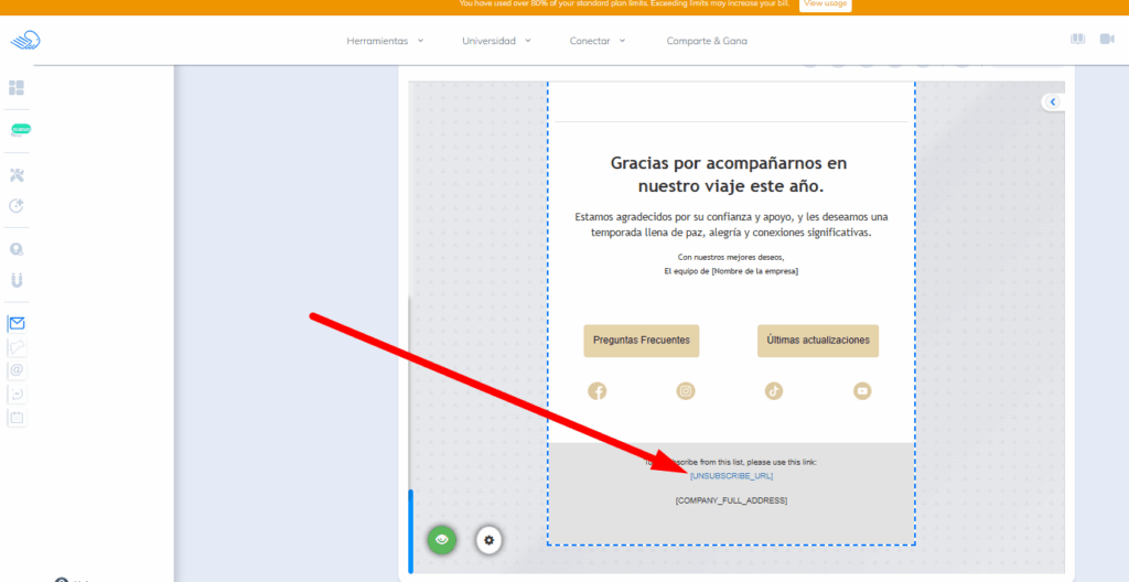 Tiene opción de cancelación de suscripción con la etiqueta UNSUBSCRIBE_URL en el pie #
