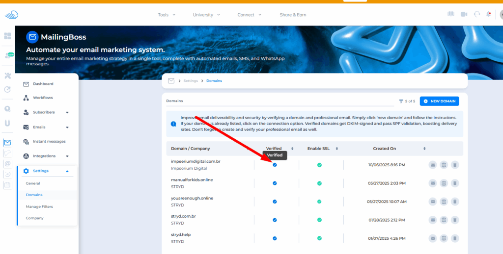 El dominio debe estar autenticado para que los envíos funcionen correctamente.